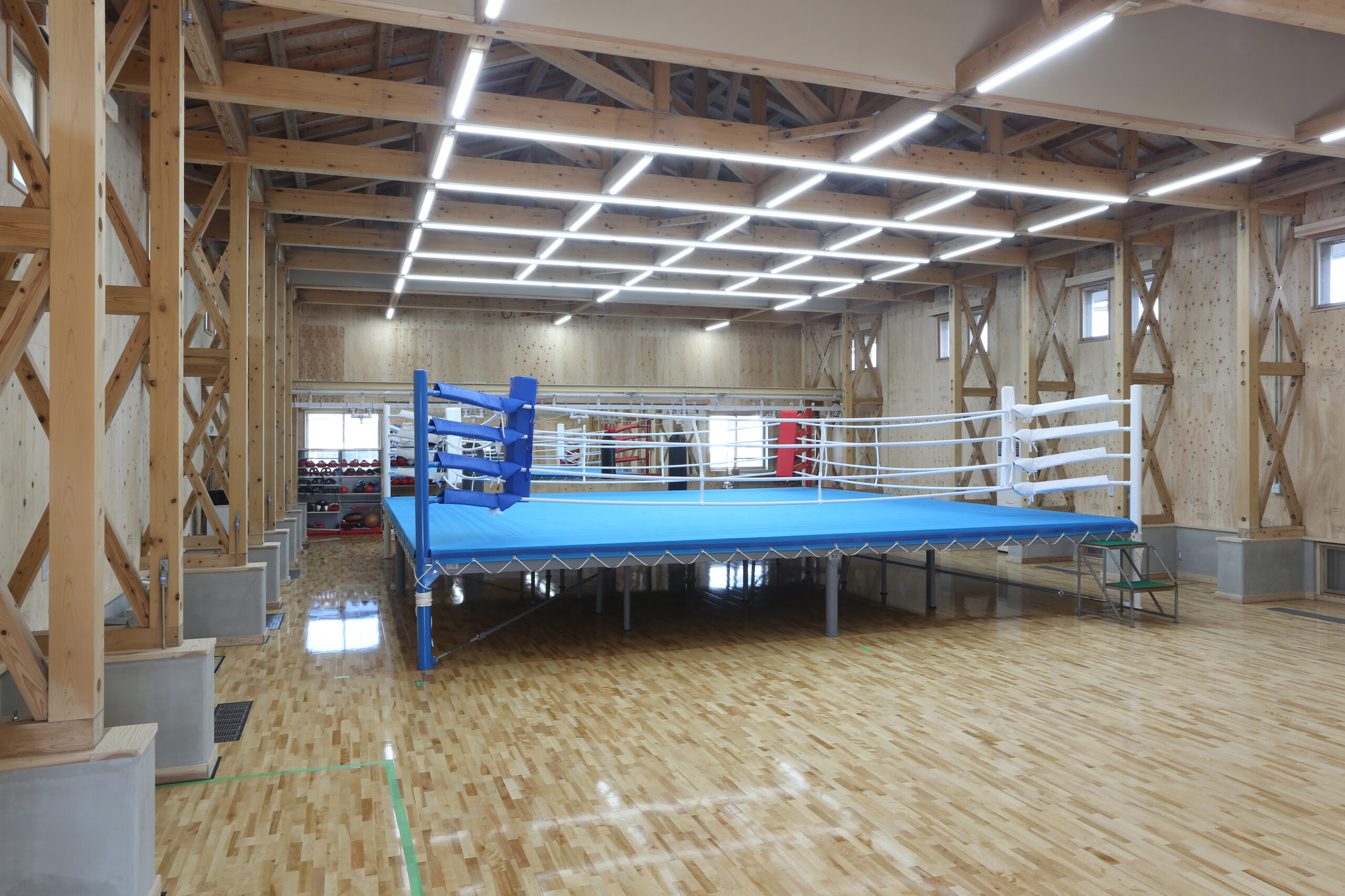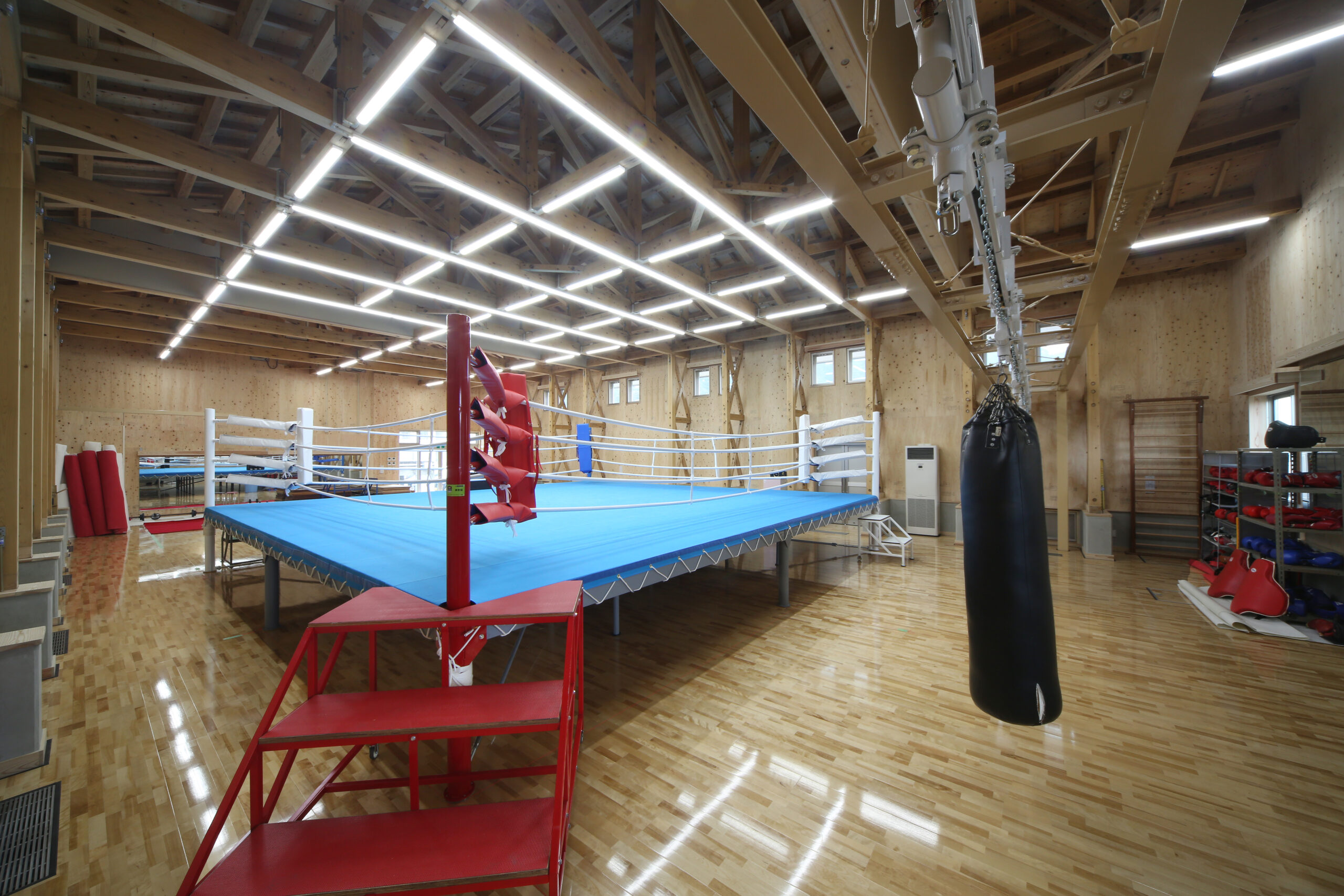 内部はリングやトレーニングスペースの配置に配慮し、効率的かつ安全に使用できる計画としています。また、木造ならではの柔らかい質感を活かし、緊張感の中にも落ち着きを感じられる環境を実現しました。